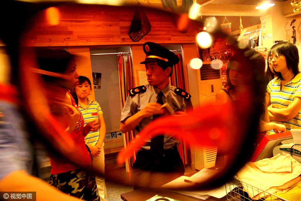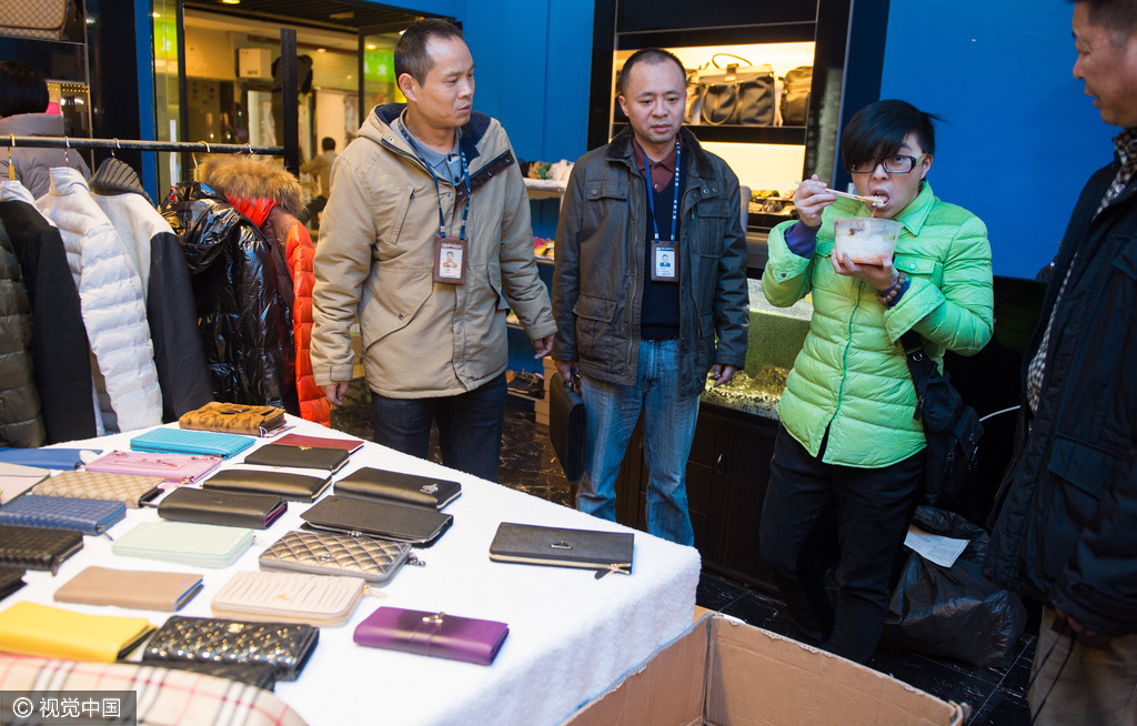 2013年11月20日,成都,合江亭工商所执法人员在店里清查时,店内的桌子上摆满了高仿的世界名牌钱夹。