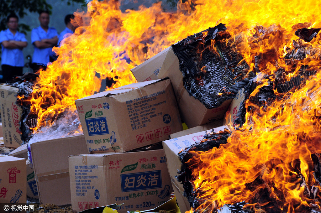 2011年6月24日,山东省临沂市郯城县工商执法人员在马头镇垃圾处理厂销毁山寨名牌卫生巾。