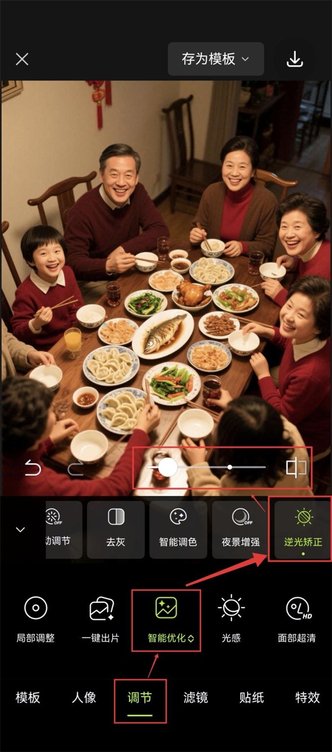 ·逆光矫正,黑脸照片原地“打光”:年夜饭合影全黑脸?只需导入图片,点击“调节-智能优化-逆光矫正”滑动调节光线,暗部提亮、肤色还原,灰片秒通透~