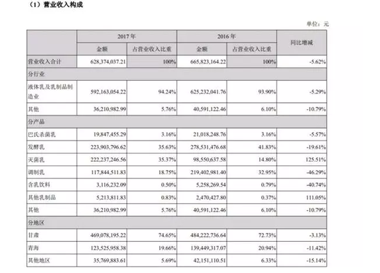 但年报数据显示,2017年,庄园牧场液体及乳制品制造业营业收入约为5.92亿元,占营业收入94.24%,同比减少5%以上。