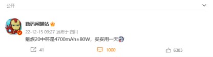 并且该博主还爆料了诸多关于魅族20的配置信息,其中热度最高的就是魅族20中杯采用4700毫安电池和80W快充,续航能坚持一天。对于此消息诸多网友有不同的观点,有的是感叹魅族20续航的进步,有的是担心魅族20如此大的电池是否还保留小屏型号,一时间热闹非凡。