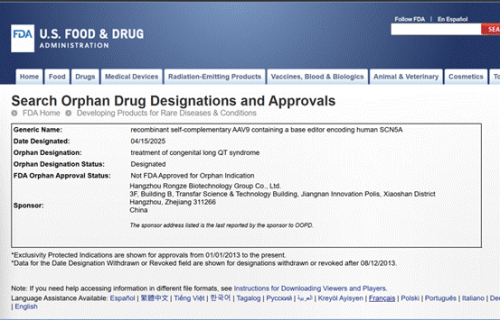 荣泽生物集团全球首款遗传性心肌病体内基因疗法获批FDA孤儿药认定