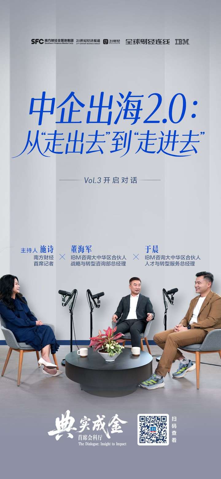 本期的《典实成金——首席会科厅》,南方财经首席记者对话了IBM咨询大中华区合伙人、战略与转型咨询部总经理董海军和IBM咨询大中华区合伙人、人才与转型服务总经理于晨,围绕企业出海2.0阶段的核心特征、面临的挑战、本土化人才建设、AI技术赋能等关键问题展开深度探讨。二人指出,当前中国企业出海已开始实现从“走出去”到“走进去”的转型,全价值链布局、品牌输出成为核心方向,但同时也面临全球经济“碎片化”、企业规模与能力错配、本土化融合难等问题,成为出海企业面临的核心考验。而搭建全球化人才平台、实现全球一体化运营、善用AI加速自身能力补位,成为中国企业突破出海瓶颈、找到属于自己的全球化路径的关键抓手。
