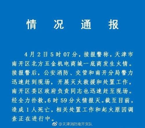 天津消防南开支队官方微博2日发布情况通报,通报称,4月2日5时07分,接报警称,天津市南开区北方五金机电商城一底商发生火情。接报警后,公安消防、交管和南开分局警力迅速赶到现场,开展灭火救援和处置工作,南开 区委区政府负责同志也迅速赶至现场。经全力扑救,6时59分火情报灭。截至目前,造成1人死亡,相关处置工作和起火原因调查正在进行中。
