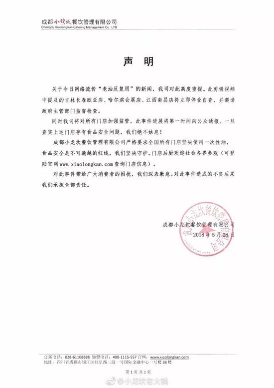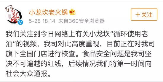 昨日,成都小龙坎餐饮管理有限公司官方微博@小龙坎老火锅 连发两条声明,回应称:被曝光的3家店铺立即停业自查,并邀请政府主管部门监督检查,并表示将对所有门店加强监管,要求全国所有门店坚决使用一次性油,此事件进展将第一时间向公众通报。