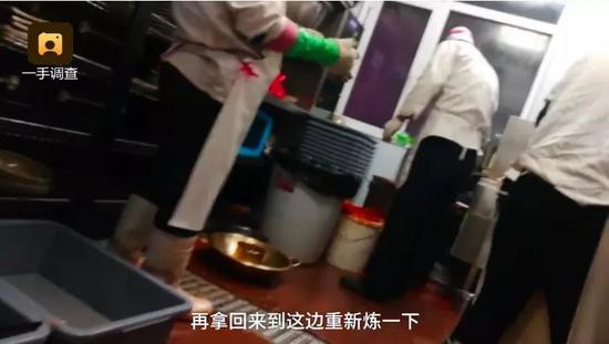 小龙坎吉林长春欧亚店,将客人吃剩的锅拿回后厨后,直接将锅底油沥在一个大桶子里——