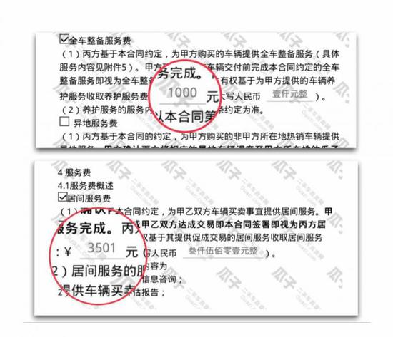 从覃先生、卖家与瓜子二手车的三方合同中可以看出,“明收暗返”的4500元,为丙方瓜子二手车收取的全车整备服务费1000元与居间服务费3501元。