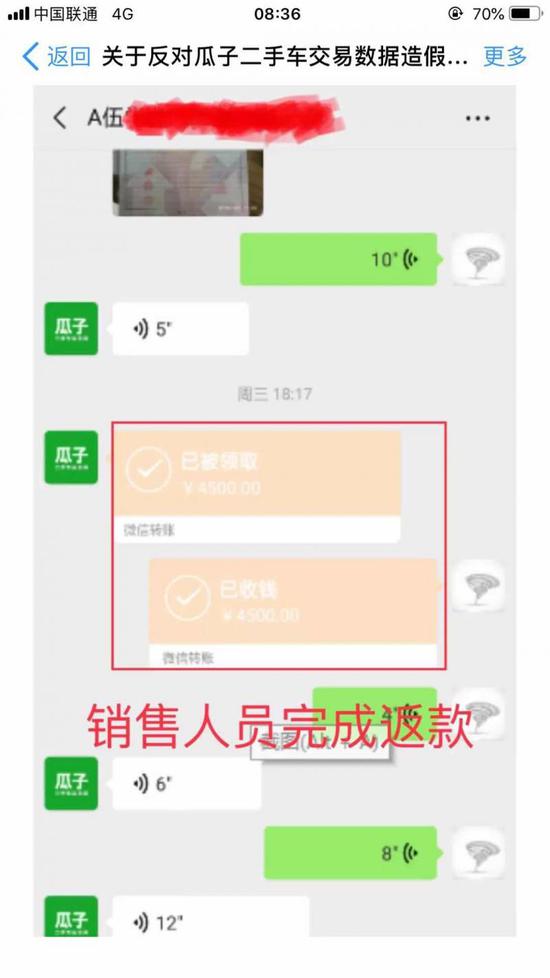 1月23日,该名伍姓销售人员通过微信返还给覃先生4500元。
