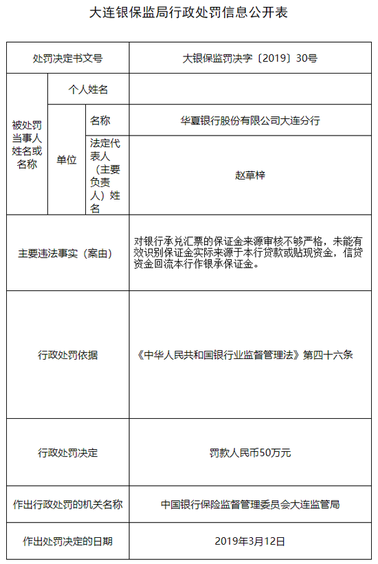 3月20日消息,大连银保监局近日发布行政处罚信息公开表显示,华夏银行股份有限公司大连分行因对银行承兑汇票的保证金来源审核不够严格,未能有效识别保证金实际来源于本行贷款或贴现资金,信贷资金回流本行作银承保证金,被罚款50万元。