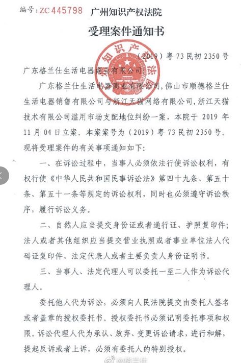 11月5日,格兰仕在官方微博发布情况通报称,已于2019年10月28日向广州知识产权法院就天猫涉嫌滥用市场支配地位等相关事宜提起诉讼,并于2019年11月4日得到受理。