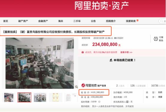 10月31日,富贵鸟第三次拍卖结束,其包括应收预付类债权、长期股权投资等破产财产最终以2.34亿成交。此前两次拍卖,富贵鸟还经历了尴尬的流拍。