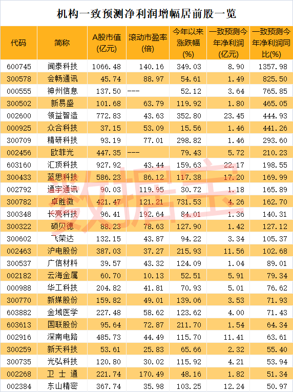 随着2019年接近尾声,华为概念股中有哪些公司业绩值得期待?根据5家以上机构一致预测的数据显示,56只华为概念股获机构一致预测今年净利润增幅超20%,其中16只个股今年净利润预测增幅在1倍以上。预测增幅最高的是闻泰科技,机构一致预测其今年净利润为8.9亿元,同比增长13.58倍。长城证券表示,预计2019年全球5G手机出货量为1300万部,2020年可达1.64亿,智能手机行业的复苏将有效带动ODM行业的需求。公司为全球ODM行业的龙头,领先优势持续扩大。预测增幅较大的还有会畅通讯、神州信息、新易盛、领益智造、众合科技。