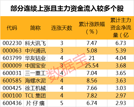 值得注意的是,932只连续上涨个股中,32只个股期间主力资金累计净流入超过亿元。其中,累计资金流入最多的为科大讯飞,主力资金累计流入6.73亿元。