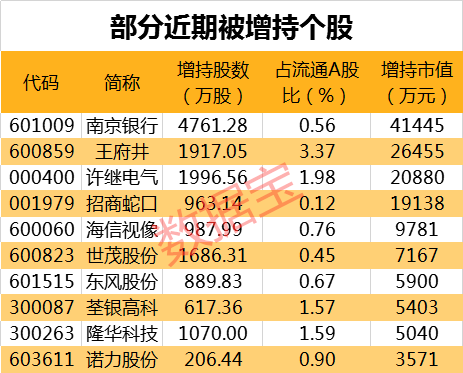 截至最新,近十个交易日有28家上市公司被增持,增持股数合计1.64亿股,增持市值达15.60亿元(增持股份变动以公告中变动截止日为准)。其中南京银行被增持的股数最多,达4761.28万股,被增持的市值达4.14亿元,占流通A股比例为0.56%;而增持股数占流通A股比例较高的公司为王府井,增持比例高达3.37%。