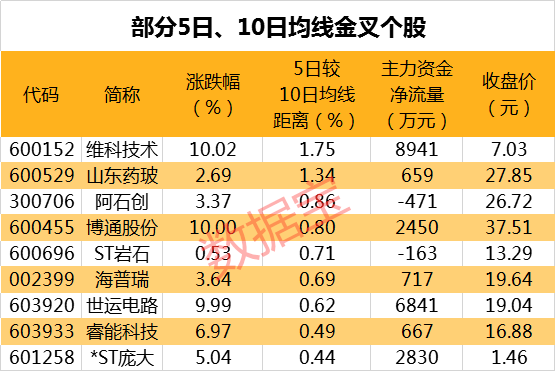 截至最新收盘,有26只A股的5日均线主动上穿10日均线,其中维科技术、山东药玻、阿石创等个股的5日均线较10日均线距离最大,分别达1.75%、1.34%、0.86%。