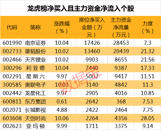 从盘口资金流向来看,主力资金净流入超千万且龙虎榜净买入个股共有14只,其中南京证券、雄韬股份、星期六等个股资金净流入金额最大。净流入力度最大的个股有一汽夏利、欣龙控股、天创时尚,净流入力度分别为100.00%、74.53%、28.05%。