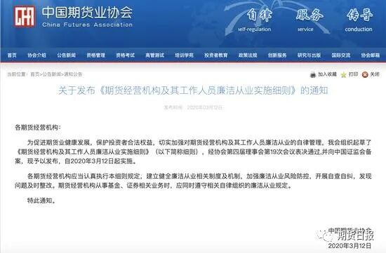 3月12日,中期协发布实施《期货经营机构及其工作人员廉洁从业实施细则》(简称《细则》),切实加强对期货经营机构及其工作人员廉洁从业的自律管理。