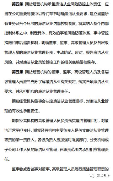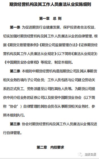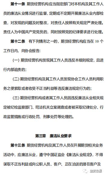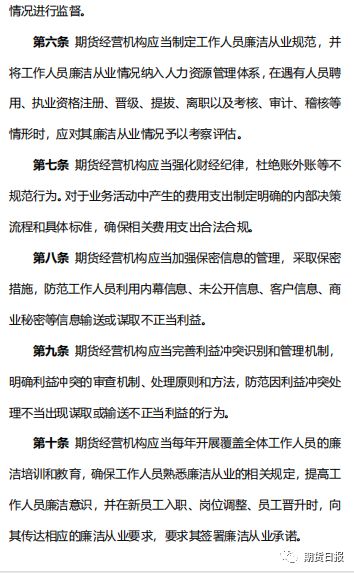 中期协当日发布的通知要求,各期货经营机构应当认真执行《细则》规定,建立健全廉洁从业相关制度及机制,加强廉洁从业风险防控,开展自查自纠,发现问题及时整改。期货经营机构从事基金、证券相关业务时,应同时遵守相关自律组织的廉洁从业规定。