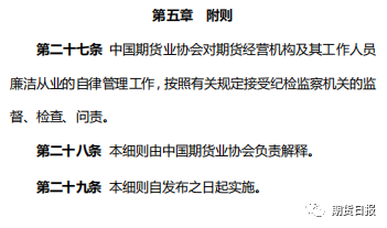 2018年6月27日,证监会发布《证券期货经营机构及其工作人员廉洁从业规定》。此次发布实施的《细则》对期货经营机构及其工作人员廉洁从业要求进行了细化规范。
