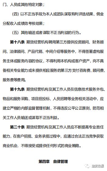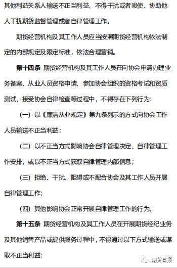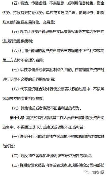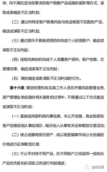 具体来看,《细则》明确了对期货经营机构及其工作人员的禁止性规定,细化了禁止期货经营机构及其工作人员在开展期货经纪业务及其他销售产品或提供服务过程中,在开展风险管理业务、资产管理业务或提供有关服务的过程中,以及在开展期货投资咨询业务中不得输送或谋取不正当利益的具体情形。