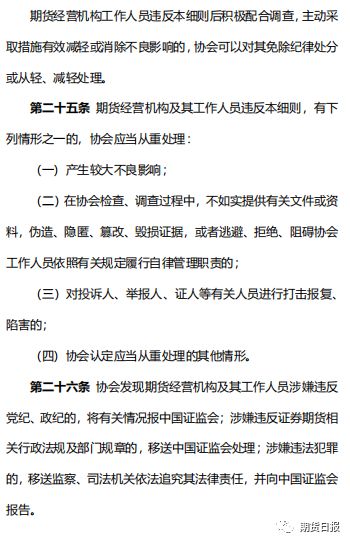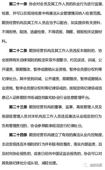 《细则》还指出,协会对会员及其工作人员的执业行为进行监督、检查,并可以在现场检查中将廉洁从业管理情况纳入检查范围。期货经营机构及其工作人员违反规定的,协会按照有关自律规则的规定采取书面警示、约见谈话、训诫、公开谴责、限期整改、暂停或撤销从业资格、暂停会员部分权利等纪律处分。其中受到训诫、公开谴责、限期整改、暂停或撤销从业资格、暂停会员部分权利等纪律惩戒的,按规定将纪律惩戒信息记入证券期货市场诚信档案和协会行业信息管理平台。