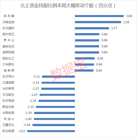 本周北上资金加仓股共470只,加仓比例超0.5个百分点的有26只。具体来看,凯利泰加仓比例最为明显,最新持股比例6.07%,环比增加1.68个百分点;其次是沃森生物,持股比例环比增加1.58个百分点;其他加仓比例靠前的还有东方园林、密尔克卫、罗牛山、美尚生态、游族网络等。