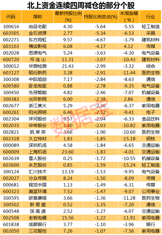 从北上资金减持股来看,阳光电源减仓最为明显,持股比例下降1.62个百分点,减仓幅度较大的还有卫星石化、祁连山、华测检测、联创光电等。