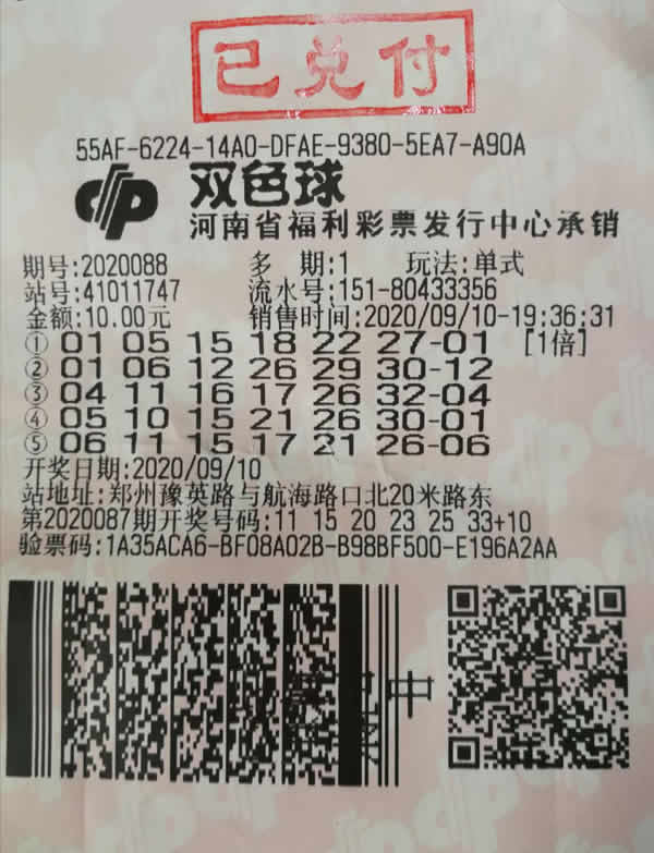 数据显示,9月10日晚,福彩双色球第2020088期开出14注头奖,单注奖金637万多元,其中河南彩民收获1注,出自郑州市豫英路与航海路口北20米路东41011747 福彩投注站,为一张单式10元票,命中当期一等奖。