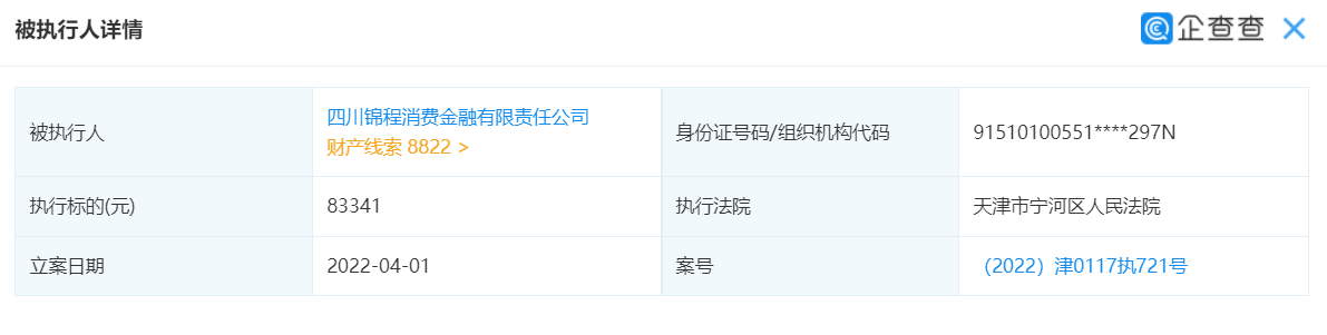 记者注意到,企查查信息显示,近日,锦程消费金融新增被执行人信息,案号为(2022)津0117执721号,执行标的83341元,立案日期为2022年04月01日,执行法院为天津市宁河区人民法院。