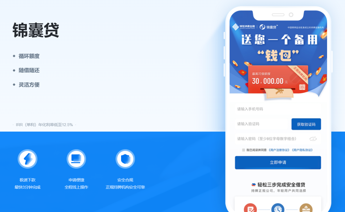 官网信息显示,产品方面,锦程消费金融的线下贷款产品为“锦享贷”,可全款房抵押、按揭房再抵押、抵押房二次抵押,最高额度20万元,年化利率为16.1%。2018年,锦程消费金融推出首款纯线上贷款产品“锦囊贷”,最高额度3万元。年化利率为12.5%起。