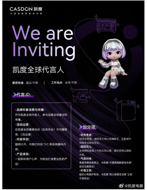 基于这场非同凡响的携手合作,凯度电器此次官宣代言的方式也不同于以往。从全网公开招聘“顶流女明星”担任全球代言人,到全民解码招聘关键词、猜测谜底,再到正式官宣杨幂,这场独有的“官宣仪式”在猎聘、BOSS直聘等专业平台和微博等社交媒体平台引发热议。