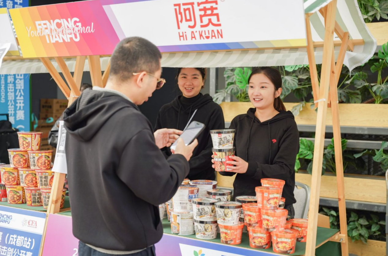 新型健康方便食品倡导者阿宽食品(白家阿宽)携旗下红油面皮、土豆泥泥面、一根粉耗子等王牌产品,作为赞助商精彩亮相本次击剑比赛活动现场。