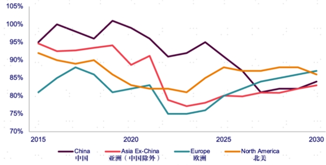 利润低迷已严重冲击装置运行,原料与能源成本高企,加之进口乙烯衍生物价格更低,导致欧洲多地乙烯裂解装置接连关闭。S&P数据显示,截至2024年底欧洲裂解装置开工率降至约75%的历史低位,较90%的历史高位存在约200万吨/年的产能闲置。2025—2027年欧洲计划退出产能430万吨,德国、法国、荷兰等地的SABIC、陶氏化学、壳牌等化工巨头均在调整欧洲战略,退出或出售化工资产。