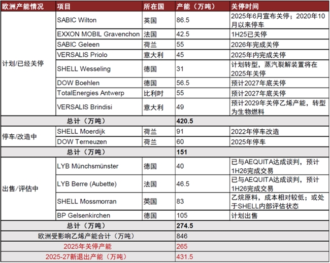 据统计,自2024年4月以来,埃克森美孚、壳牌、SABIC、陶氏、Versalis与道达尔能源等跨国石化企业,已永久关闭或计划2027年前关闭欧洲七套裂解装置,另有数套装置正寻求出售。据Commodity Insights数据,此轮产能削减涉及欧洲约450万吨/年乙烯、230万吨/年丙烯及43万吨/年丁二烯的名义产能。