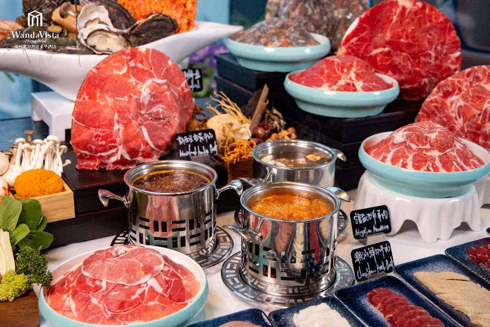 此次焕新不仅聚焦高端派送菜品,火锅区也实现全新升级。酒店精选多款特色锅底,涵盖重庆大排麻辣汤底,松茸走地鸡汤底,桃屋泡菜朝鲜辣露汤底等多种口味,满足不同食客的口味需求;同时,肉类食材全面更新,严选各类高品质鲜肉,纹理清晰,肉质鲜嫩,搭配升级后的锅底,奏响舌尖上的火锅交响曲。