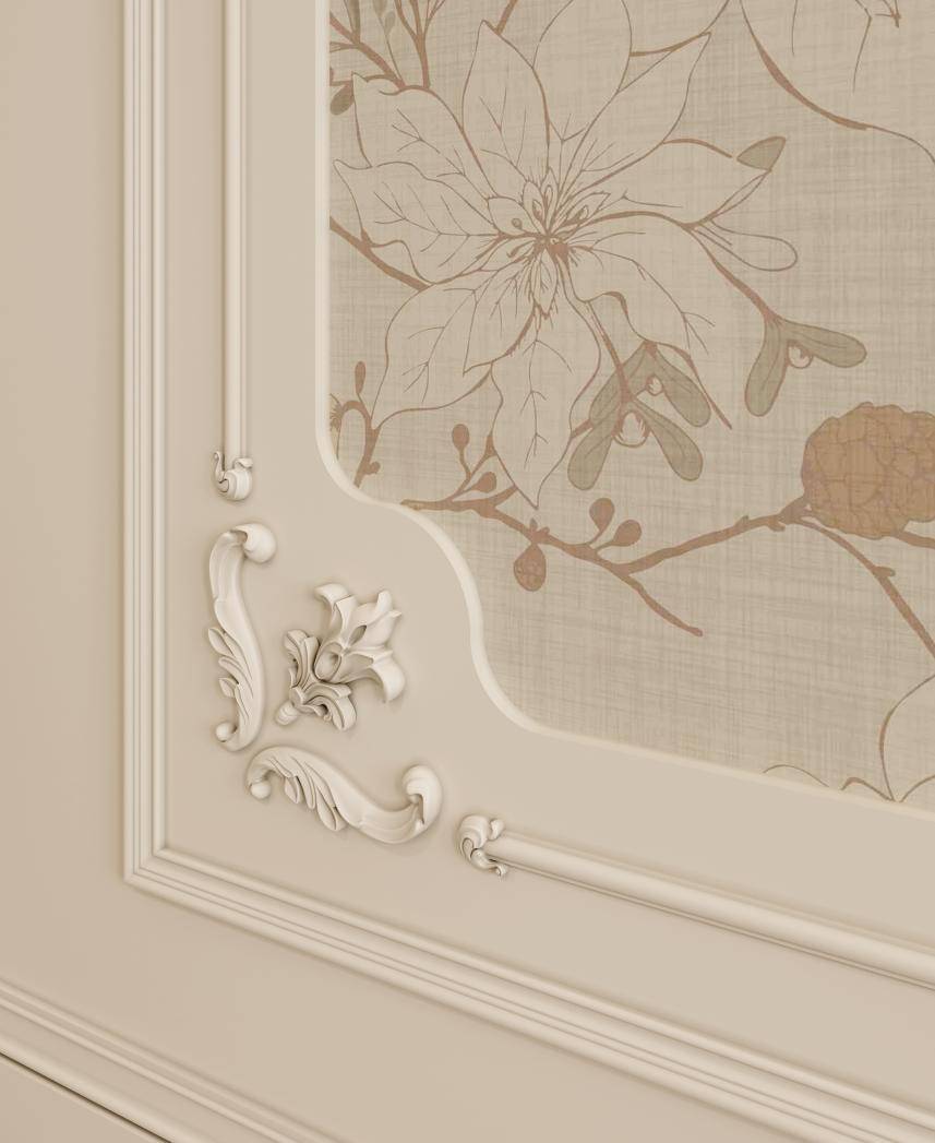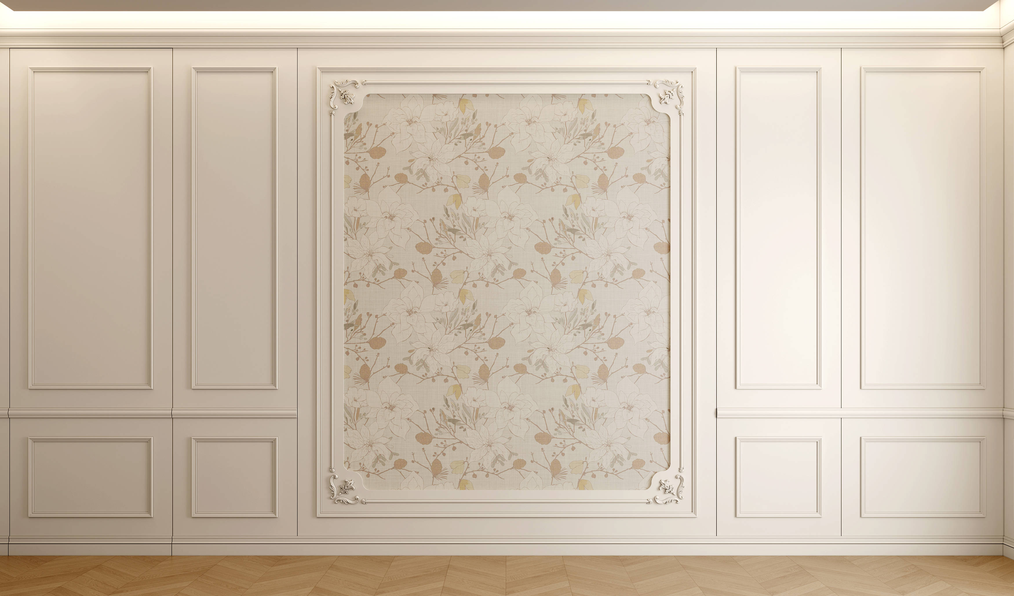 客厅空间是理性秩序与感性的浪漫共鸣。作为家庭社交与活动的中心,客厅通过几何护墙的应用,首先建立起清晰、开阔、充满现代感的理性空间框架,上下分布符合黄金分割比例,有效创造了视觉净土,让墙面成为秩序的背景。与此同时,可灵活选配的花窗护墙则像嵌入这幅理性画卷中的抒情段落,以其柔美的花卉纹样,瞬间软化空间气质,开辟出一个可供独处、阅读或亲密交谈的浪漫角落。二者或独立呈现,或和谐相融,再辅以鸢尾精雕角花于转折处的精巧点缀,共同完成了一场时空的巧妙转换,让人足不出户,便能领略Loire河谷的优雅风情与艺术格调。