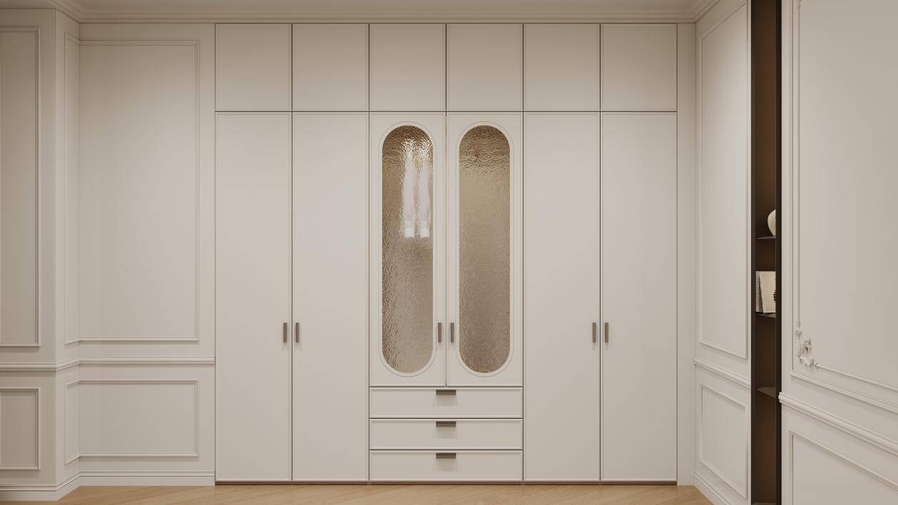 卧室空间重点呈现出静谧包裹与私密仪式感的交融氛围。卧室是终极的休憩与修复之所。整体空间在白色主基调营造的纯净、静谧氛围中展开,局部以墨脱黑进行恰到好处的点缀与压衬,让气息沉淀,视觉归于宁谧。柔波柜门是塑造空间情绪的关键,其蜿蜒的弧线带来视觉上的柔软抚慰,朦胧玻璃后的物件影影绰绰,平添一分梦幻与私密感。每一次开合柜门,定制金属拉手所带来的细腻手感与恰到好处的阻尼反馈,都将日常动作升华为一种充满仪式感的优雅体验。更令人惊喜的是,柜内精心装饰的繁花纹样背板,在每次开启的瞬间显露,为最私密的更衣时光,注入一份不期而遇的愉悦与美好,于细微处彰显对居住者情绪价值的深切关怀。