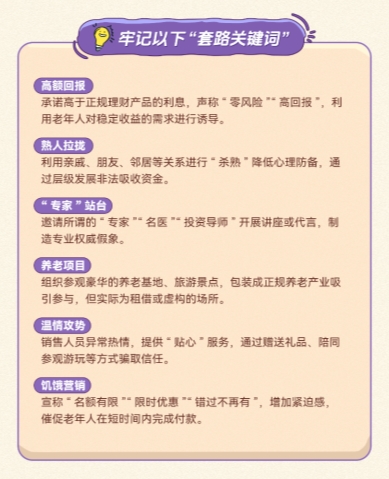 老年群体依然是防范非法金融活动重点宣传对象,养老领域的非法集资手段套路不断翻新,极具欺骗性,常见以“养老服务项目”为噱头,承诺高息保本回报,骗取老年人的养老钱。老年人应牢记以下“套路关键词”,增强防范意识,遇事多与子女沟通。