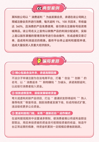 随着互联网的发展,电商网购已深入群众生活。部分不法分子将非法集资包装成创新电商模式,宣称时间短、投入少、收益高,诱骗消费者参与。此类非法集资模式依托于网络,具有传播面广、诱惑性大、形式新颖等特点,应谨慎鉴别骗局手法套路,以免被“收割”。