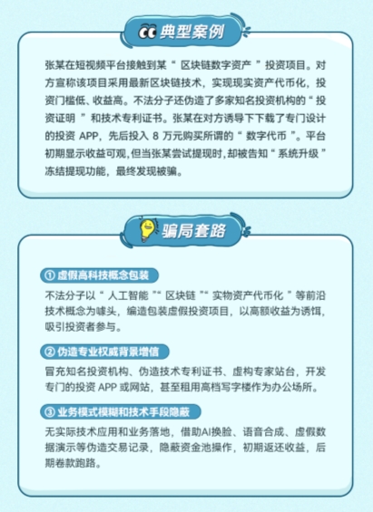 此外,近年来,一些不法分子利用“新概念”“新场景”设置骗局,编造包装所谓的“高科技”投资项目,虚假宣传高额收益并吸收公众资金,严重侵害群众财产安全。提醒广大消费者要树立正确的投资观念,不要安装下载来历不明的App,对于不了解的技术概念切勿盲目跟风投资。