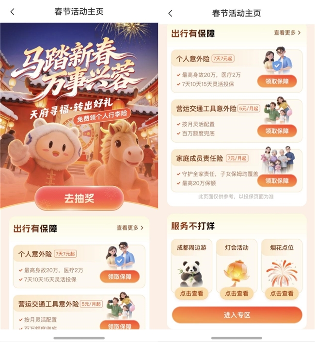 保险护航,助一路团圆:推出个人意外险、营运交通工具意外险、短期境内旅游意外险等多款亲民出行保险,团圆更安心~