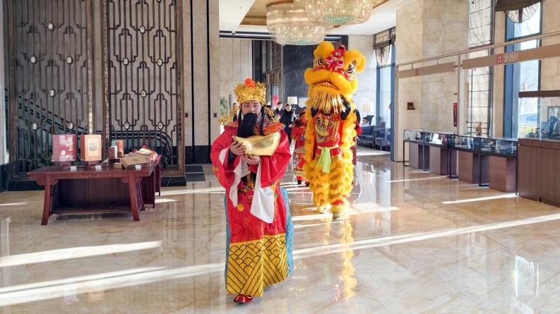 伴随锣鼓声,祈福及舞狮活动于8时18分在酒店正门举行,舞狮团队呈现点睛、采青、吐福、旺铺等,财神与宾客互动,发放“元宝巧克力”,让宾客感受浓厚的节日氛围与传统文化的魅力。