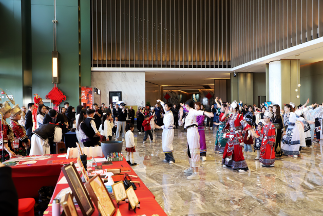 值得一提的是,本次新春活动以“籽籽同心·游园图”为主线,匠心打造了一条集游戏、手作、文化体验于一体的民族文化长廊。酒店提供免费妆造服务,宾客可以更换自己喜欢的民族服饰融入整体活动中去,并以铜币为流通货币,穿梭于苗族、傣族、藏族、鄂伦春族等各民族特色摊位之间,通过各种特色游戏互动以及姿势问答赢取铜币,用来体验扎染、民族特色DIY等互动手作,近距离感受非遗文化的魅力,同时也可以品尝三道茶、五色米、苦荞制品等地道民族小吃。多元化的活动设置让全家老少都能乐在其中,感受浓浓的年味。