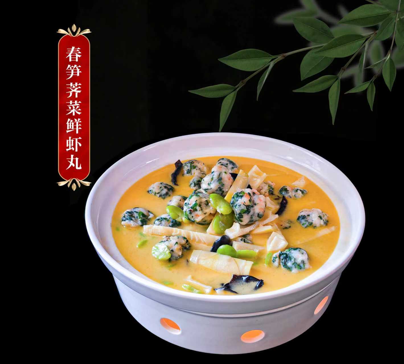 春笋芥菜鲜虾丸,集春日三重鲜味于一体。精选鲜嫩春笋、清香芥菜与鲜活大虾,手工打制而成。春笋脆嫩清甜,芥菜清新解腻,大虾肉质紧实、鲜而不腥,三者相融,口感 Q 弹爽滑,层次丰富。