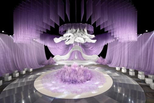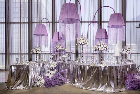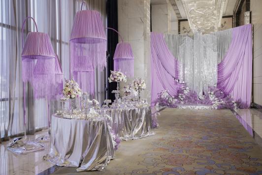 3月14日,长沙万达文华酒店大宴会厅化身为一片无垠紫境,渐变纱幔与水晶灯交织出梦幻光影,褶皱花艺与镜面装置勾勒出流动的星辰。这场以“曦”为主题的婚礼秀,不仅呼应了白色情人节的浪漫氛围,更以“晨曦微光”为灵感,寓意爱情如初升的朝阳般温暖而永恒。