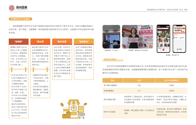 数字化转型是丽尚国潮 ESG 实践中支撑高效运营与风险管控的重要抓手。公司围绕专业市场、百货零售、商业管理三大板块搭建数字化平台矩阵,通过“丽潮购”“丽达通”等系统实现交易、物流、管理全链路线上化,推动线上线下深度融合,在提升经营效率与服务体验的同时,以数据驱动实现资源集约利用。与此同时,公司高度重视信息安全与数据隐私保护,建立完善的数据治理与安全巡检机制,2025年实现客户隐私泄露、数据安全事故双“0”发生,将合规与安全理念贯穿数字化全过程,让技术创新与可持续发展同向发力,为高质量运营注入稳定数字动能。