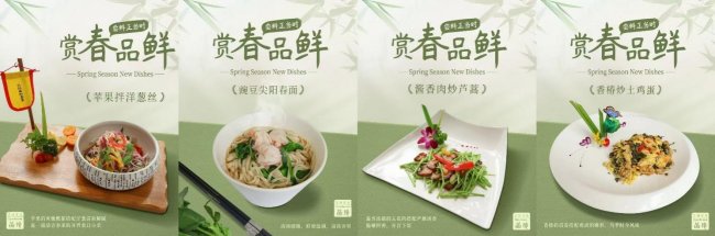 【春芽野菜?清鲜本味系列】:苹果拌洋葱丝——鲜爽开胃,春味清口;豌豆尖阳春面——鲜蔬微辛,春意入面;酱香肉炒芦蒿——野蔬清香,鲜爽下饭;香椿炒土鸡蛋——春味头牌,齿颊留香。