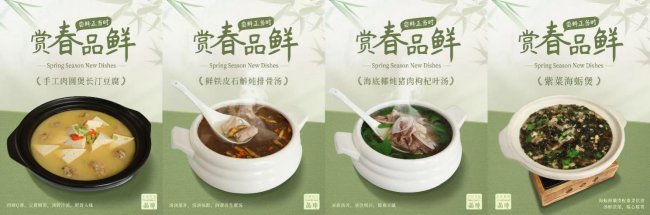 【春润暖煲?汤鲜养人系列】:铁皮石斛炖排骨汤——清润滋补,春日养身;海底椰猪肉枸杞叶汤——甘润解腻,鲜润回甘;五花肉海蛎紫菜煲——海陆双鲜,浓鲜入味;手工肉圆煲长汀豆腐——手工匠造,软嫩鲜香。