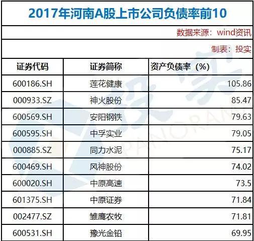 从资产负债率上看,2017年河南78家A股上市公司负债率超过60%的,达20家;其中资产负债率最高为莲花健康,105.86%。其次为神火股份85.47%、安阳钢铁的79.63%。