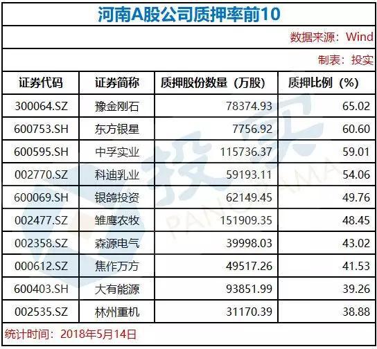 截止到2017年5月14日,78家豫企合计质押股份148.71亿股。其中,质押比例最高为豫金刚石,65.02%,质押股份7.84亿股;其次为东方银星质押比例60.6%,7756.92万股;中孚实业质押比例59.01%,11.57亿股。
